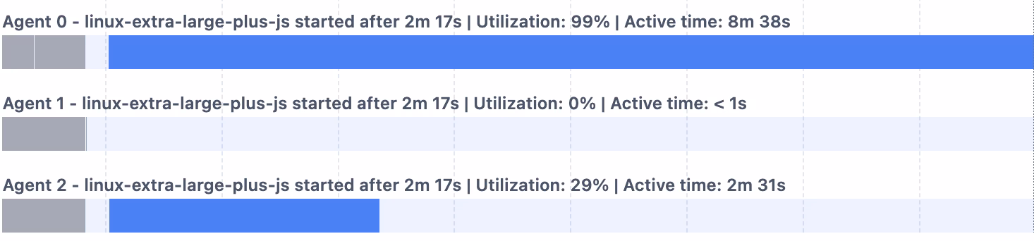 If we run the same setup but leverage the new fine-grained typecheck tasks, we can see how the distribution is much more optimal. Now, all three agents are utilized, reducing the runtime to approximately 3m 29s, which corresponds to the slowest agent.